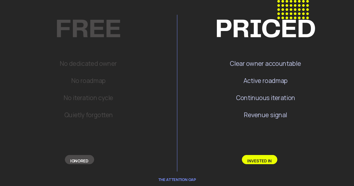 Once a feature has no budget, it has no future. The price tag isn't about extracting money from customers – it's about creating the internal signal that says: this thing matters enough to get better.