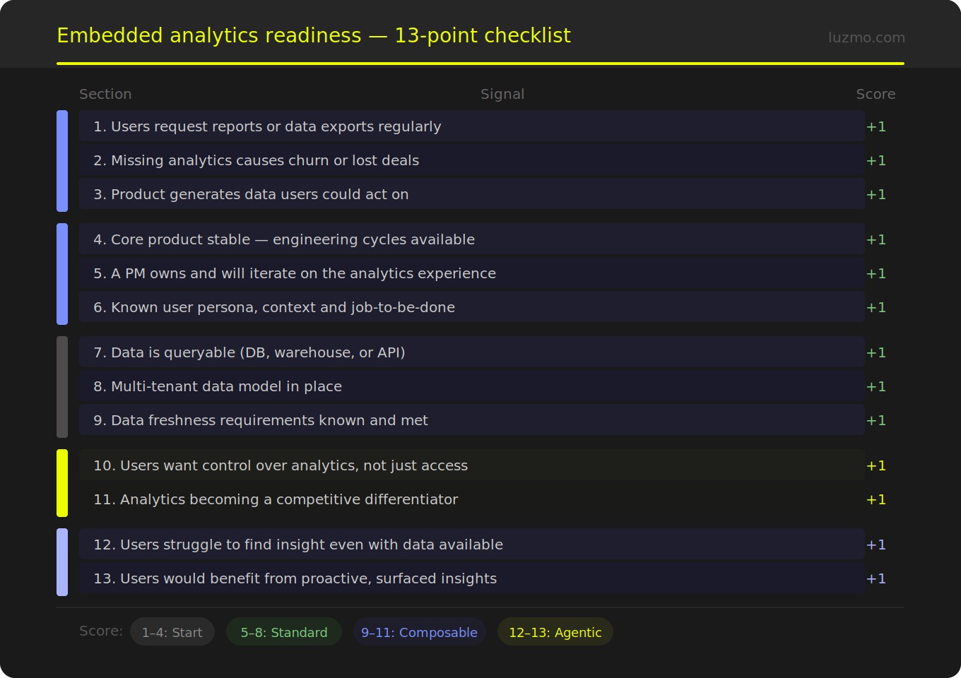 This checklist is about product readiness. It's designed to help PMs and CPOs figure out not just whether they can embed analytics, but whether they should – and if so, what level of sophistication is appropriate for where they are right now.