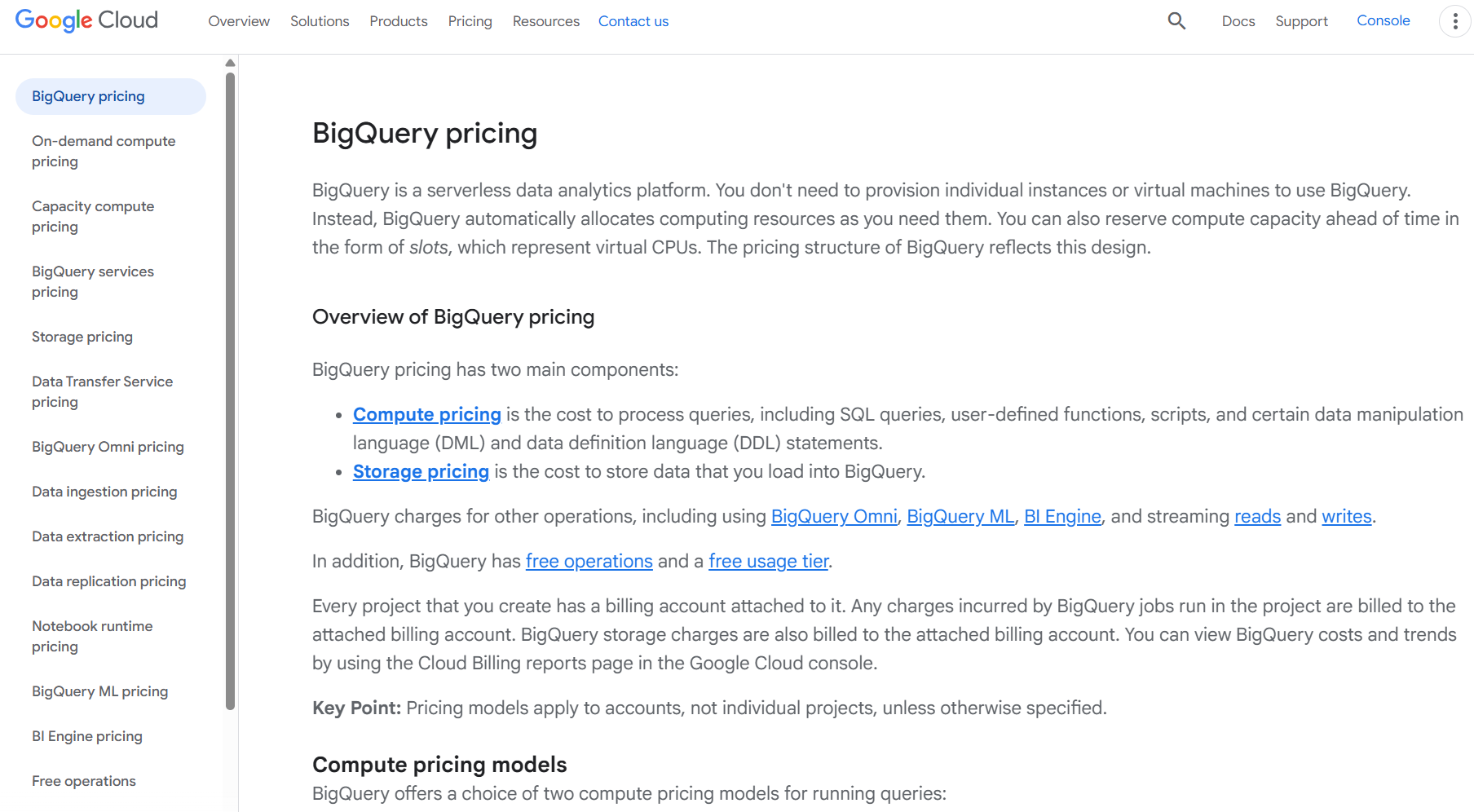 BigQuery’s default on-demand pricing model bills by bytes processed or slot hours, which means if you run many large queries, billing can grow quickly. Redshift requires more manual management (clusters, scaling) but gives more control.