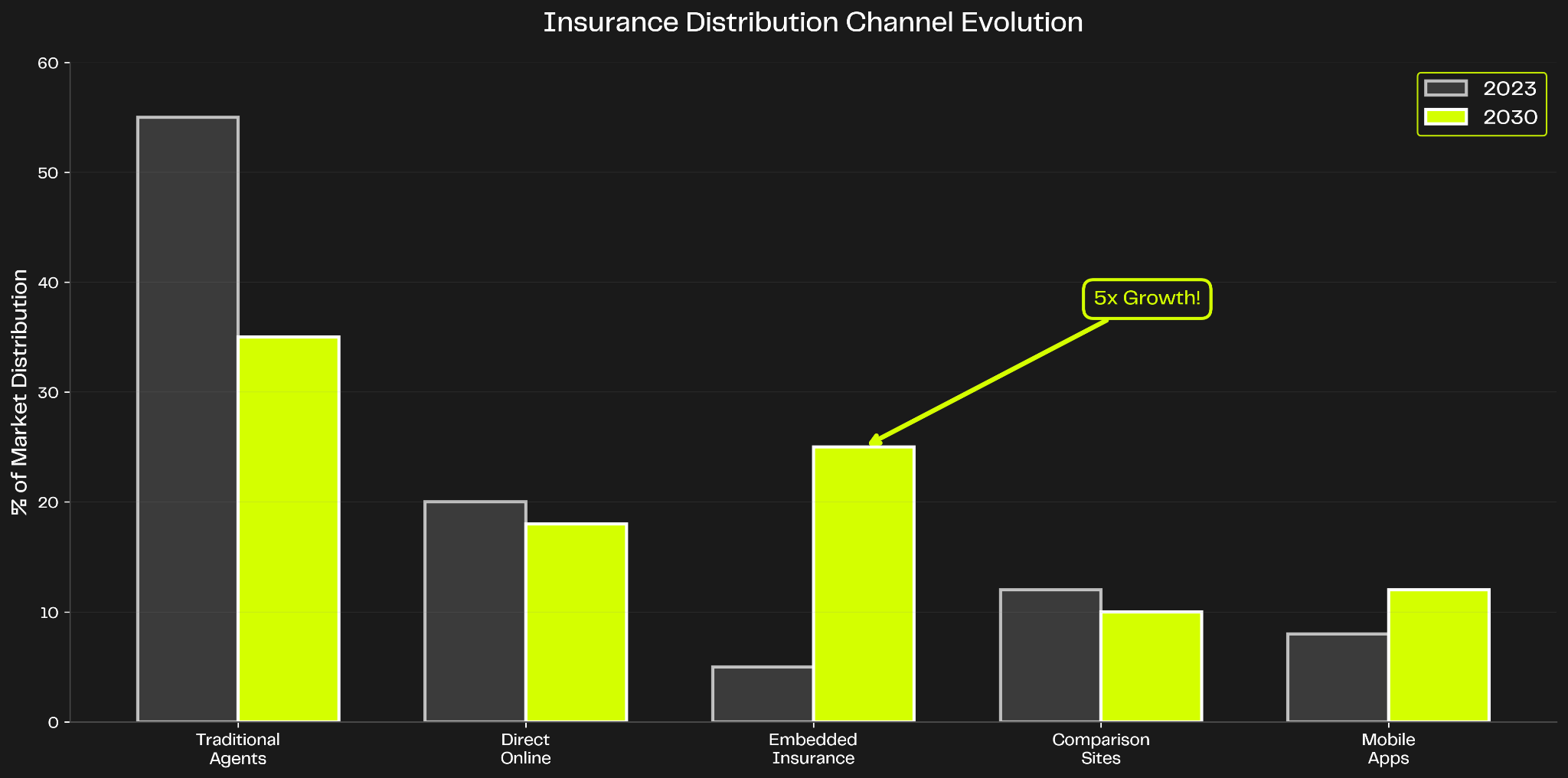 Embedded insurance represents the fastest-growing distribution channel, projected to grow from 5% of the market in 2023 to 25% by 2030. This is a 5x increase in just seven years.