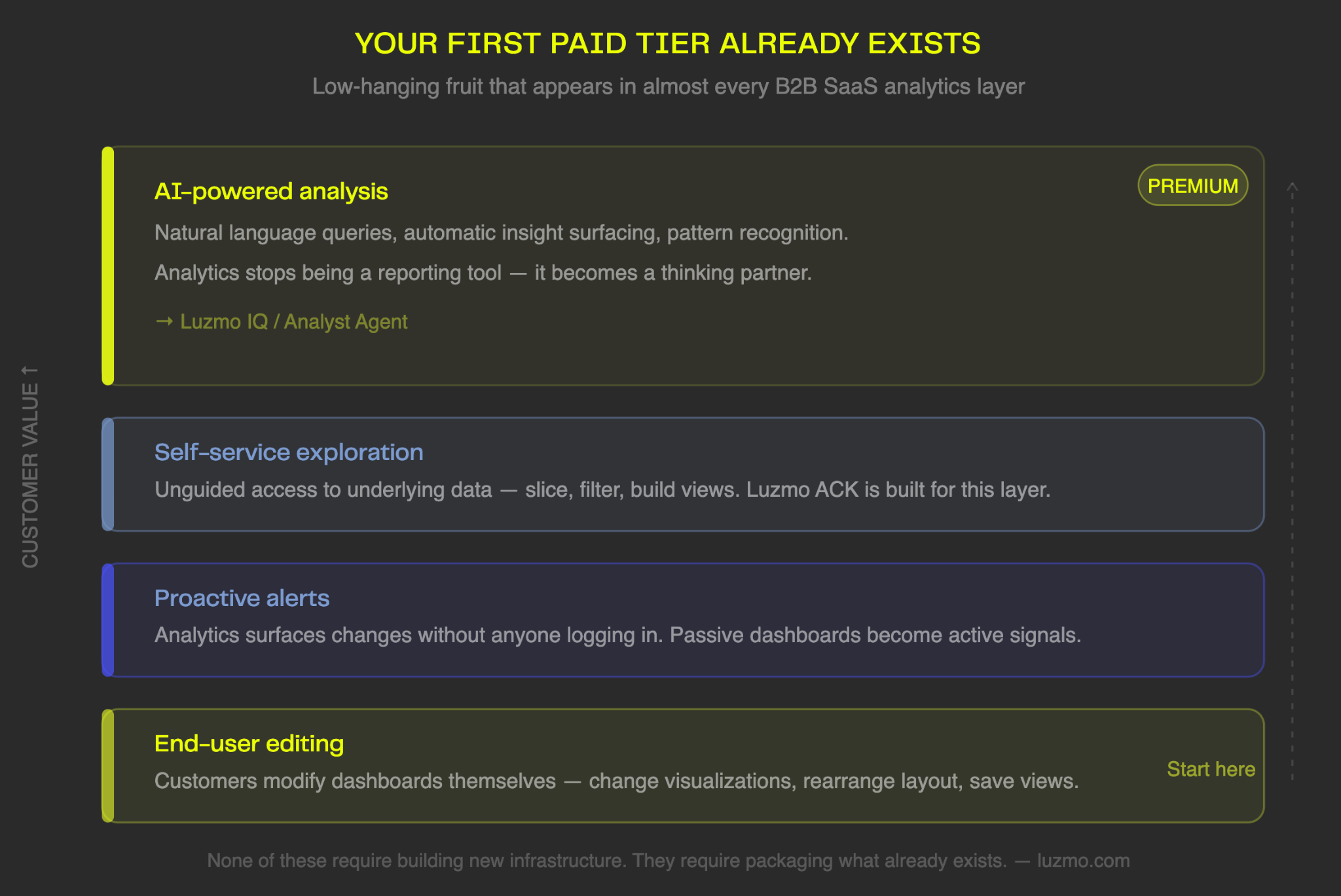 When Karel Callens at Luzmo reviews a customer's analytics setup before they start charging for it, the first thing he looks at isn't the tech stack. It's whether the customer can actually stand behind what they're about to sell — whether the data is trusted internally, whether there's one person who can make decisions and move the work forward, and whether anyone has actually asked buyers if they'd pay. The governance question comes before the pricing question. If the answer to any of those is no, the pricing conversation is premature.