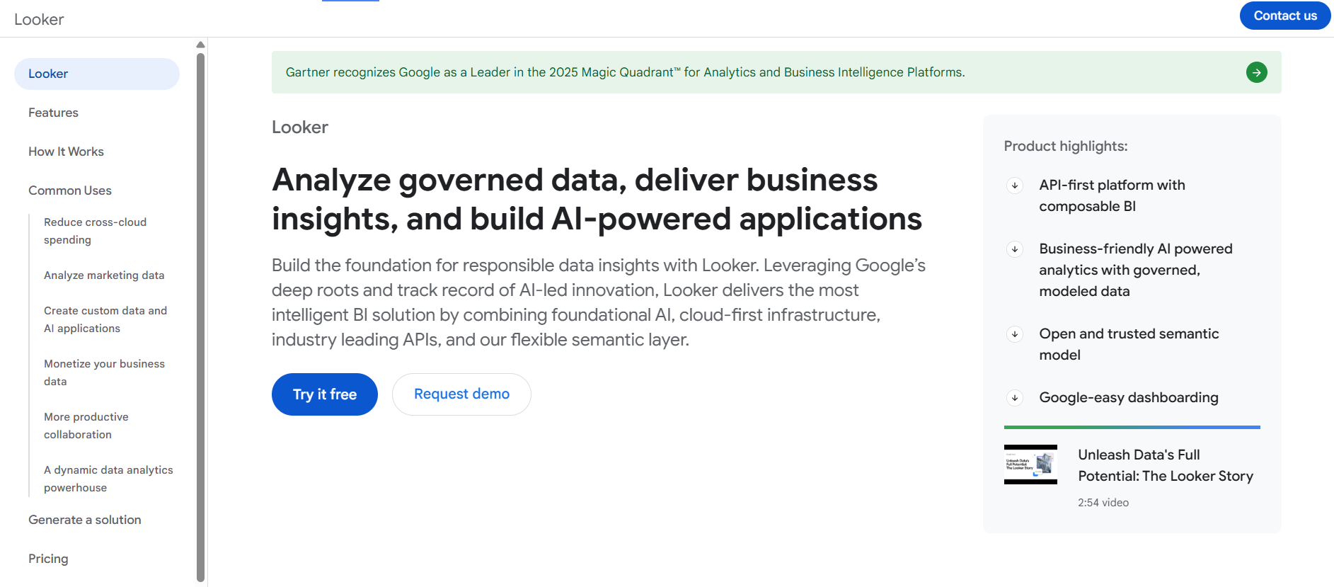 AI‑powered analytics - In 2025 Looker introduced generative‑AI capabilities powered by Google’s Gemini models. Users can ask natural‑language questions and get dashboards automatically generated. The AI features include a Conversational Analytics agent that builds charts from plain language and a Visualization Assistant that produces reports, slides and LookML code suggestions. These additions simplify self‑service and help non‑technical users explore data without SQL.
