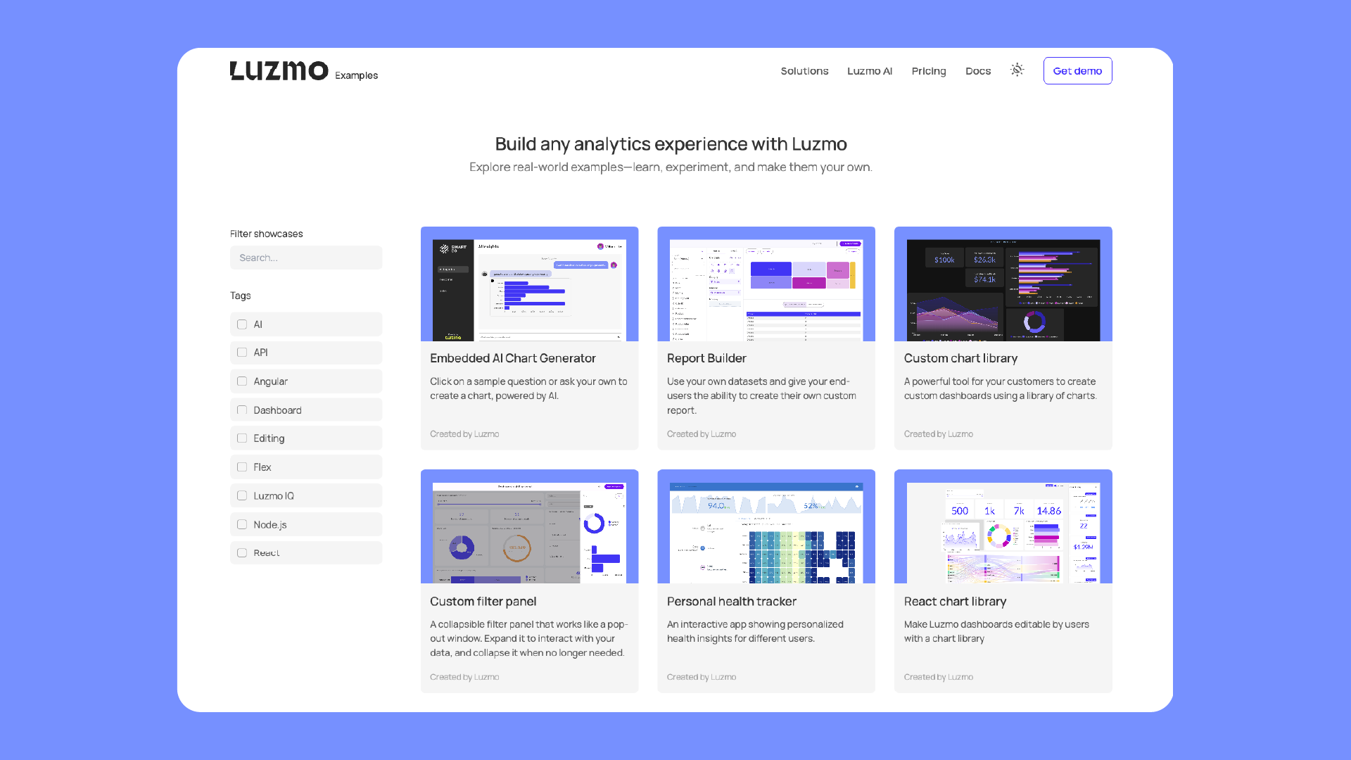 Explore a curated collection of real-world implementations built with Luzmo. Each example highlights different integration approaches, showcasing how Luzmo's components (e.g. Flex, APIs) work together to solve business challenges across industries.