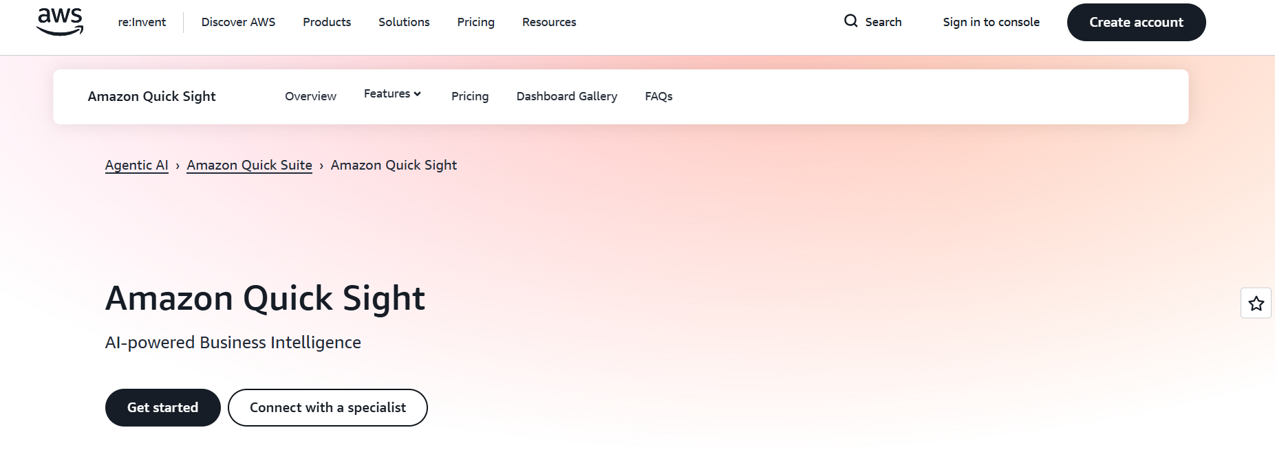 Amazon Quick Sight is the AWS cloud platform for business intelligence. It offers some cutting-edge features, such as natural language processing and machine learning, allowing end users to easily explore data by asking questions in plain English. It is also praised for its fast performance, even when working with large datasets.