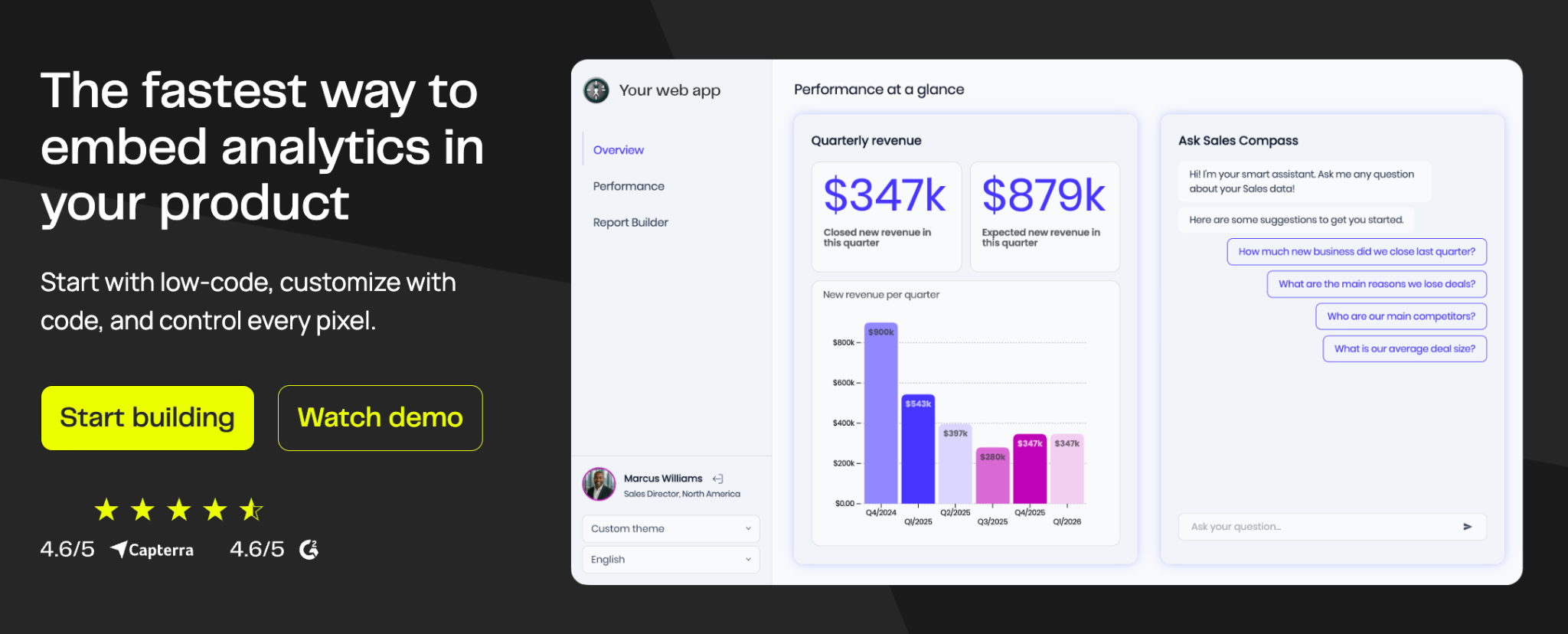 Compare this to 6-12 months building in-house, plus ongoing maintenance overhead. The time-to-value difference is dramatic. You're delivering customer-facing analytics while competitors are still scoping requirements.