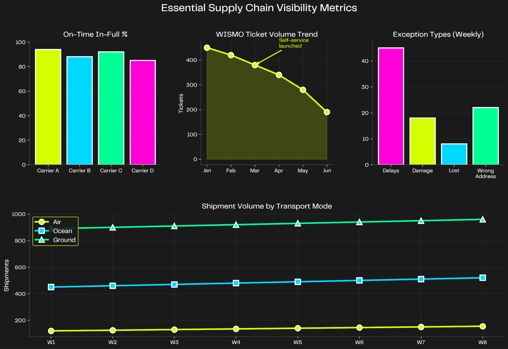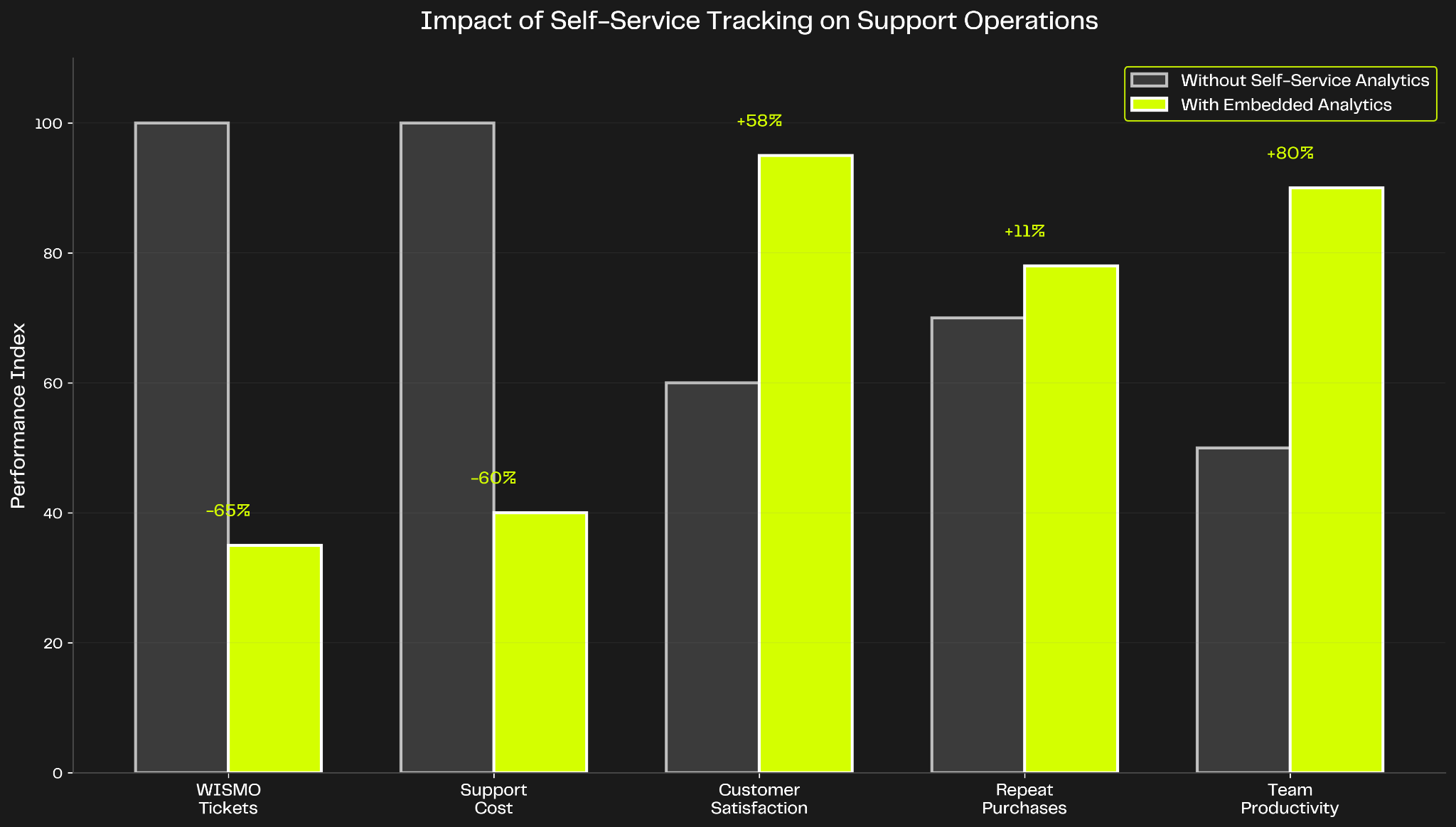 Customer experience metrics: WISMO ticket volume trends, delivery satisfaction scores, tracking page engagement rates, and proactive notification effectiveness. These metrics show whether your self-service analytics are actually reducing support burden and improving customer satisfaction.