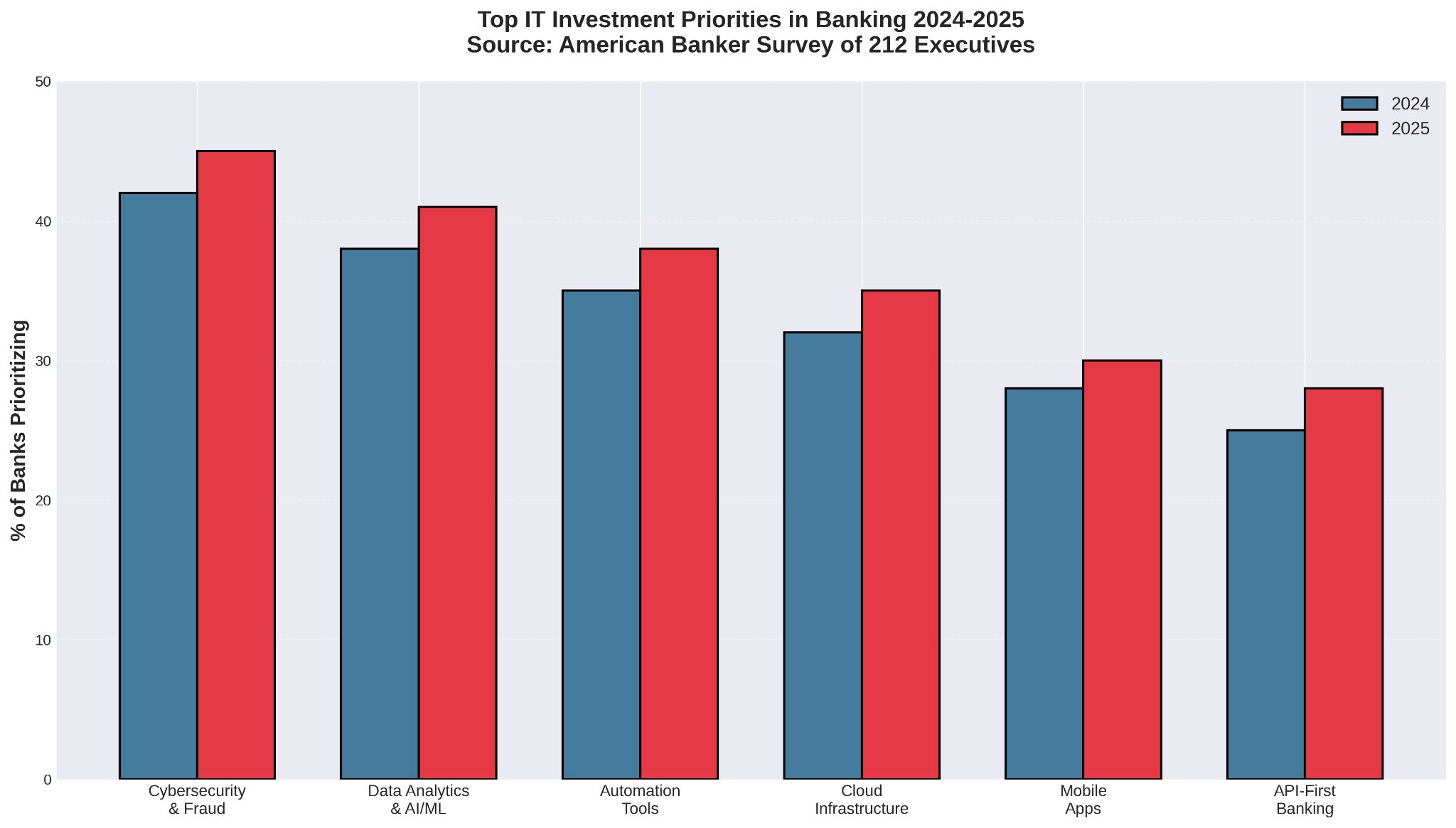 According to American Banker's 2025 survey of 212 banking executives, the top IT investment priorities are: