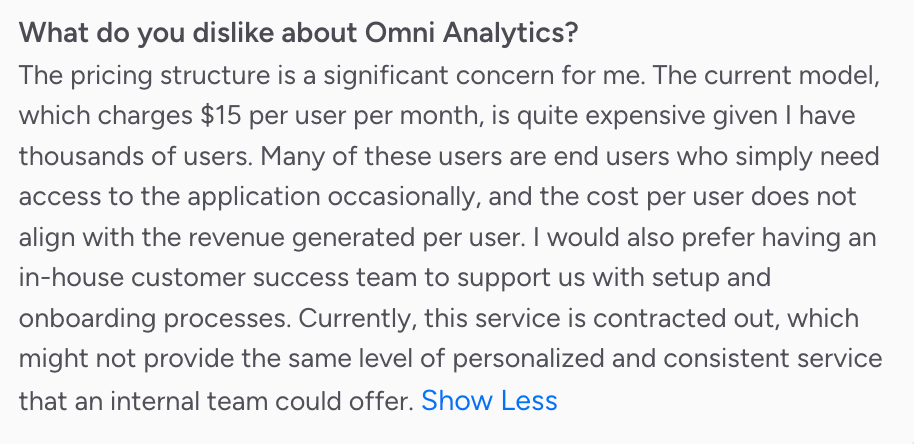 The sentiment we heard most often: "It was immediately upfront. Flexible and transparent pricing." One customer added that a discount during the sales process signaled something beyond the number itself: "That was an act of goodwill, and you could see they wanted us as a customer."