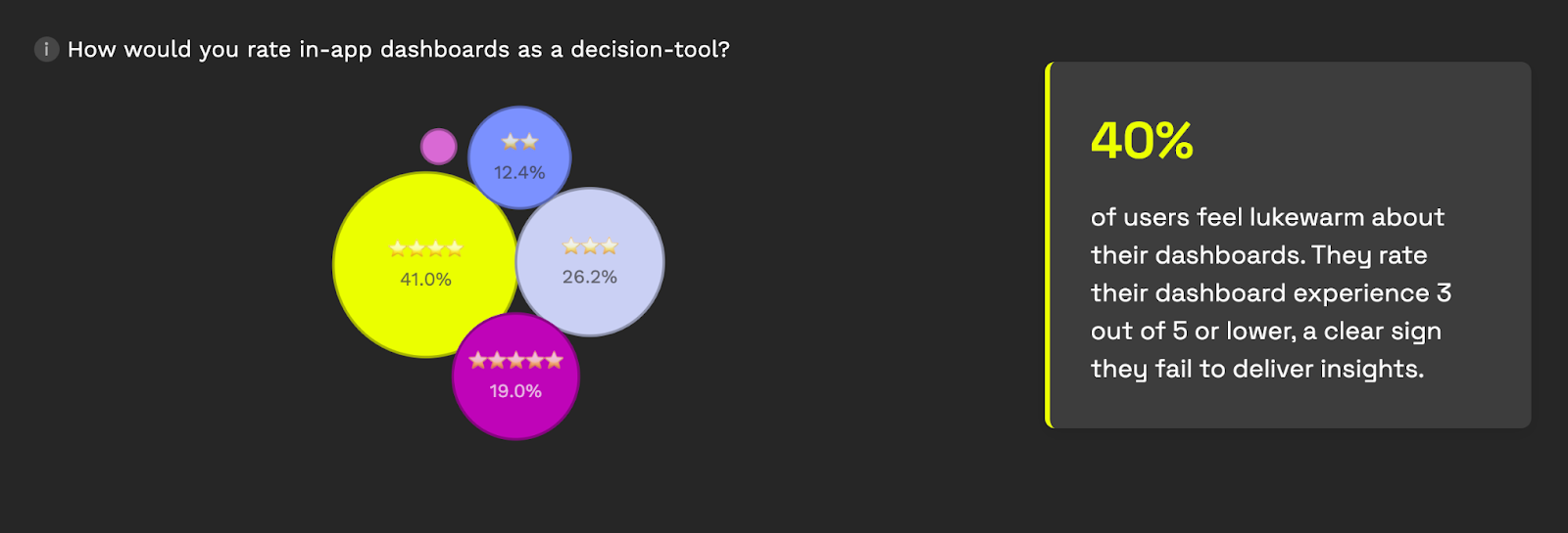 Think about that for a second. Four in ten users look at your analytics feature (the one you spent months building and integrating) and say "this doesn't actually help me decide anything." That's not a minor UX issue. It suggests the analytics experience isn't fully aligned with how users actually make decisions.