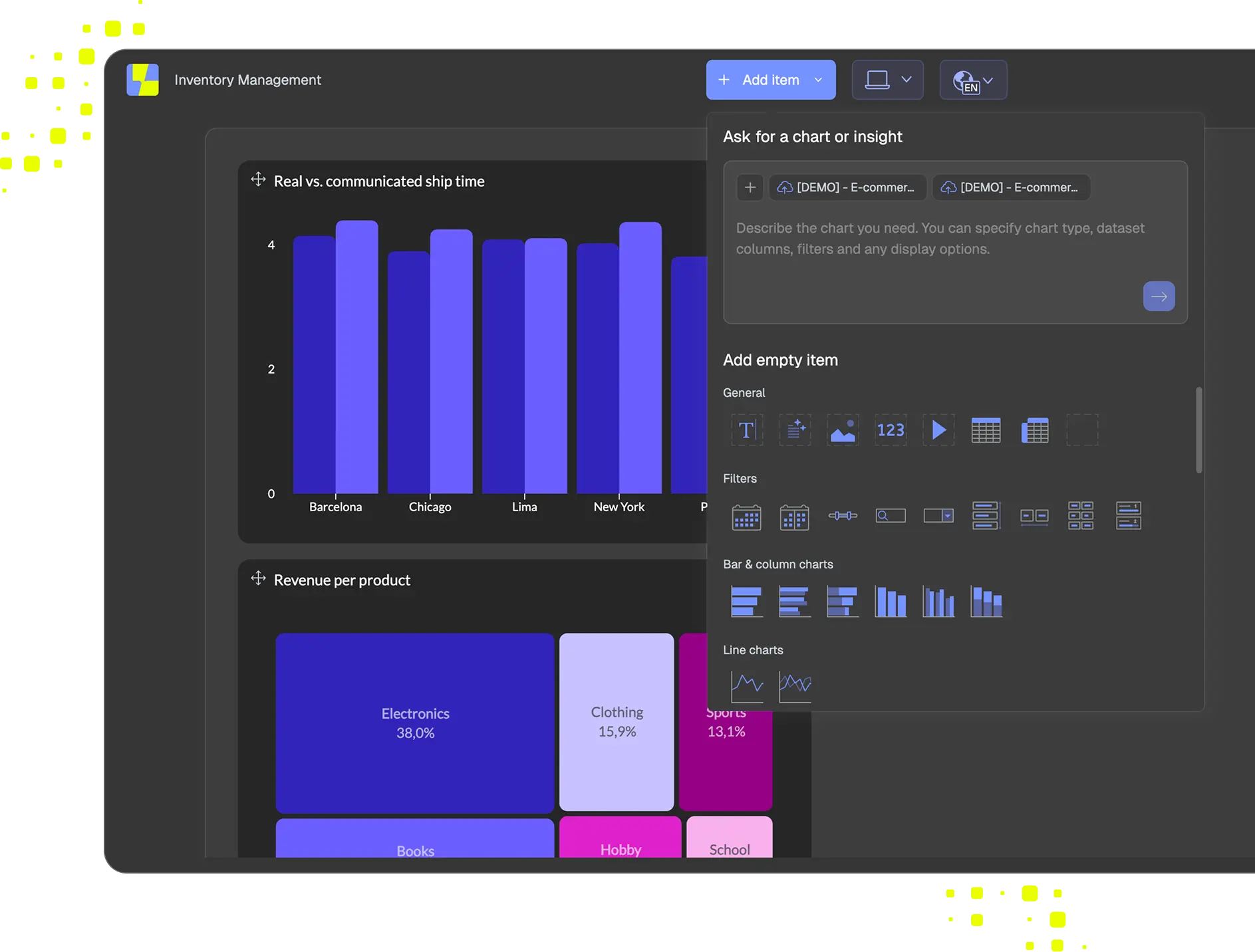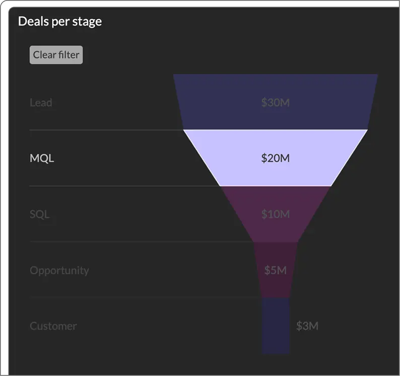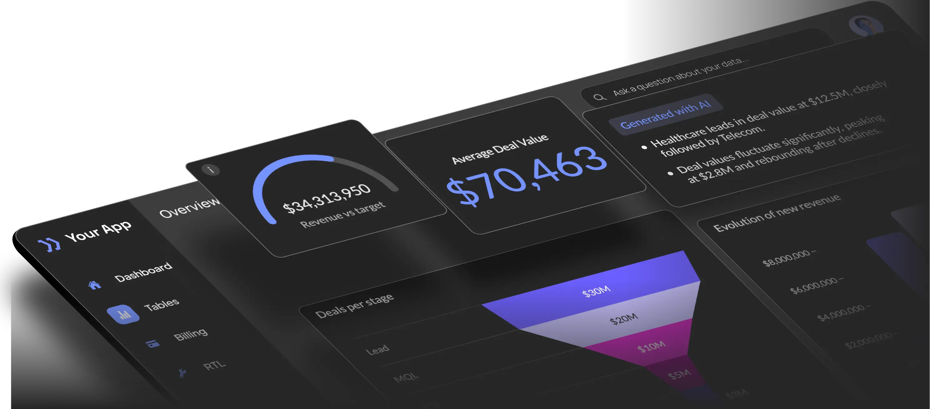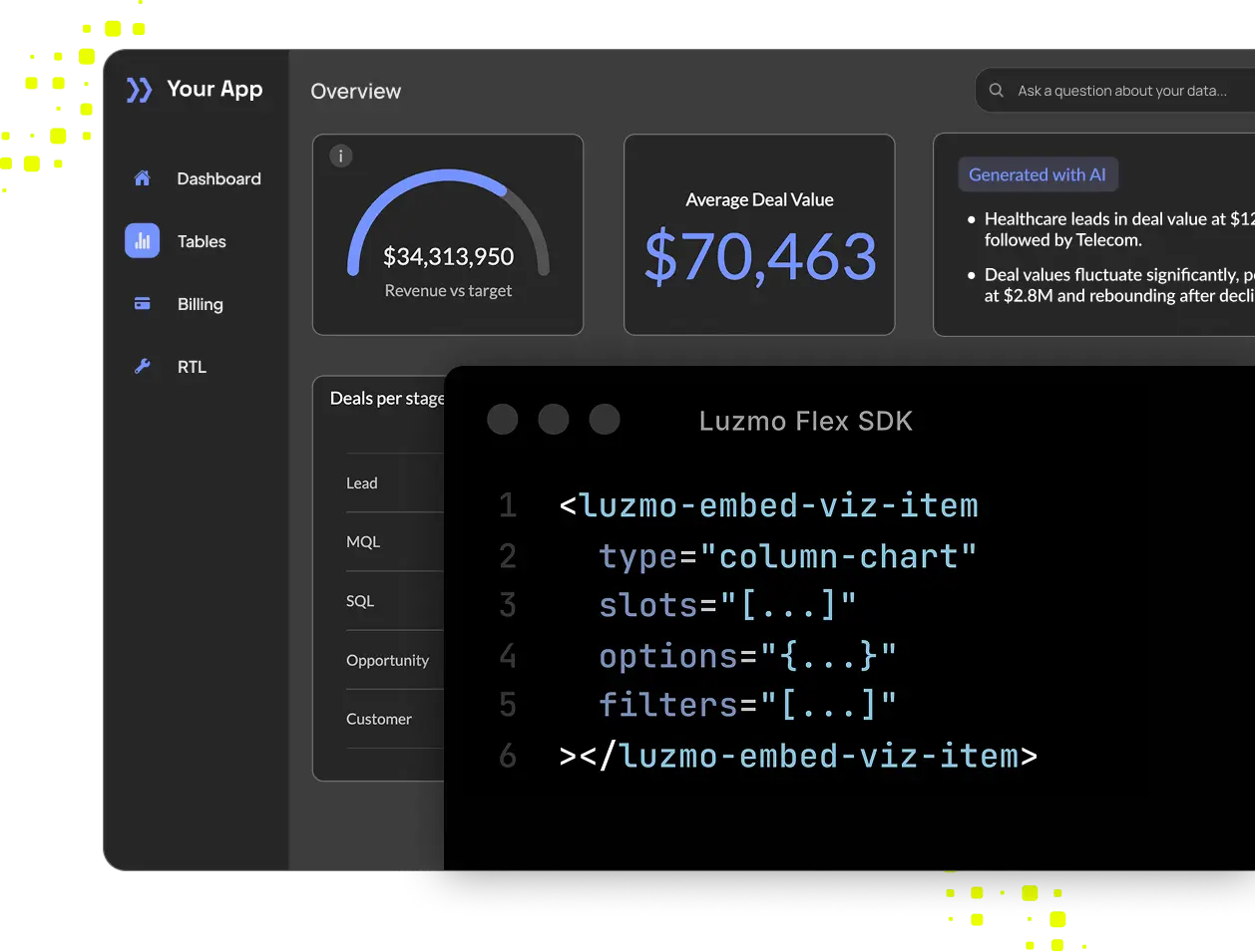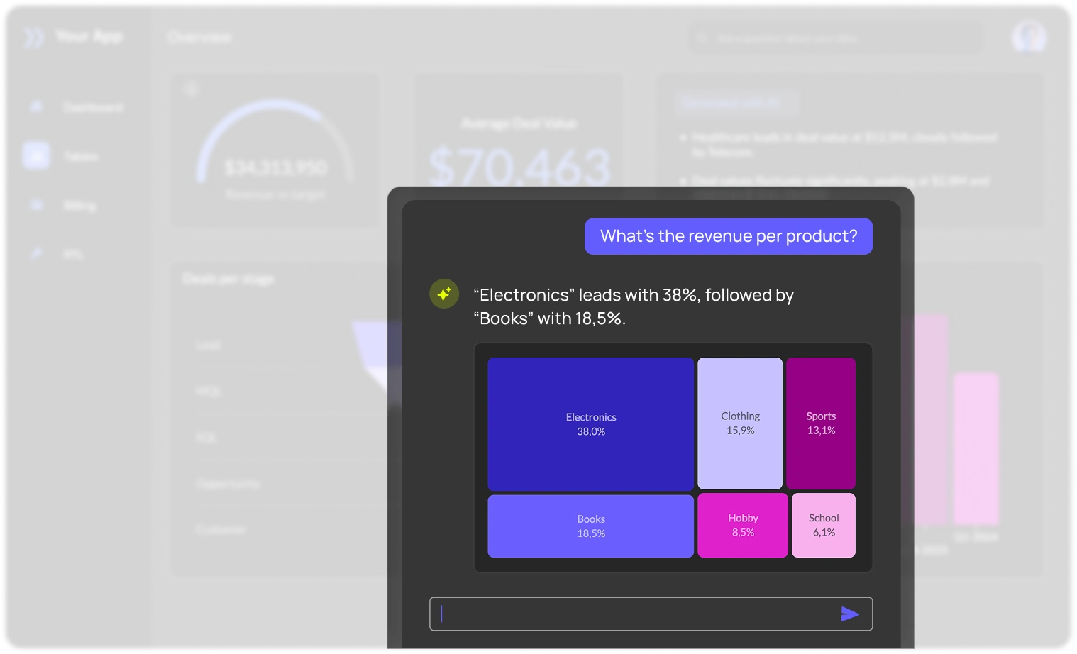 Interactive data visualizations, right inside your product. Everything underneath ships as part of your product, not a separate BI tool.