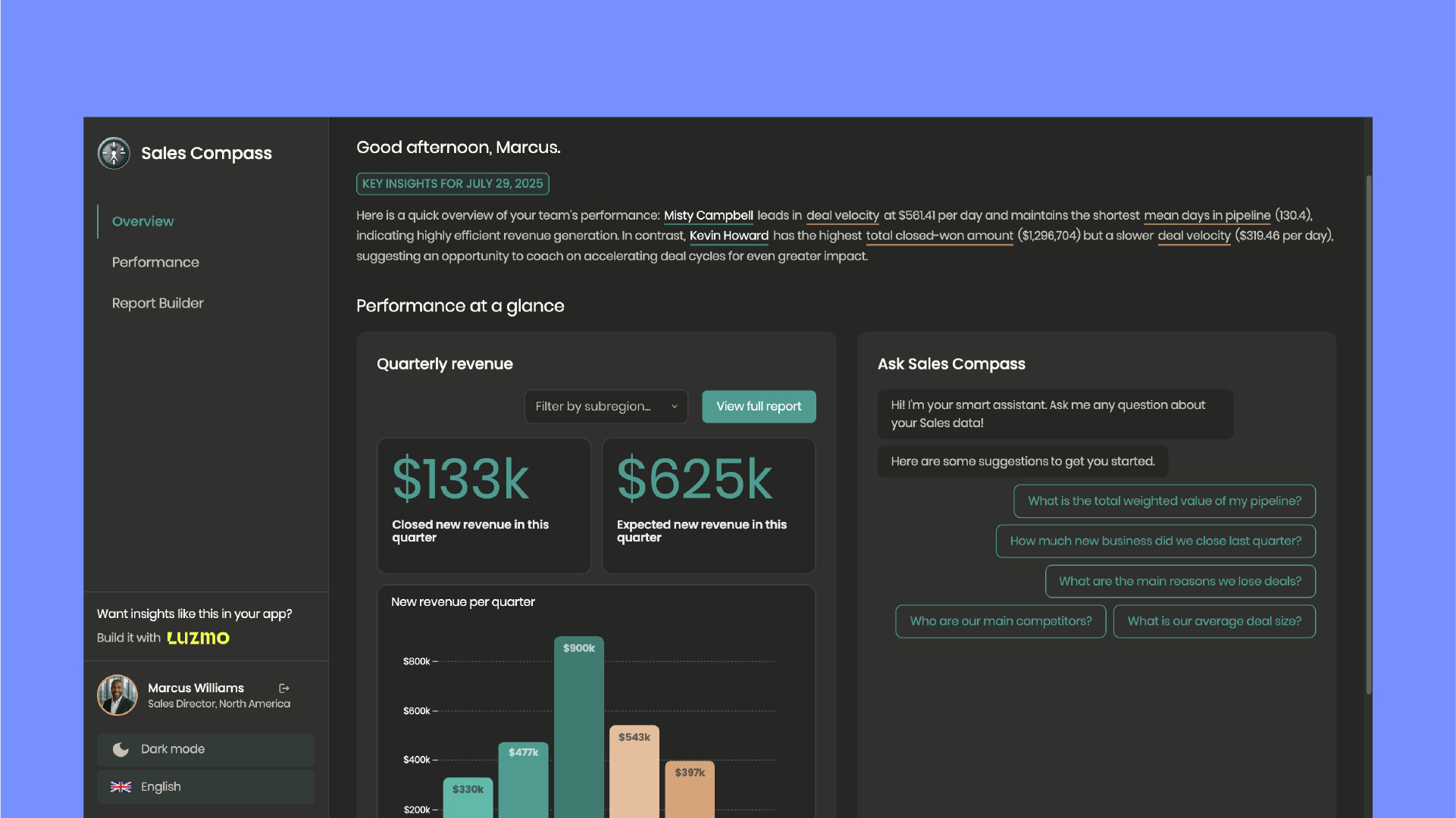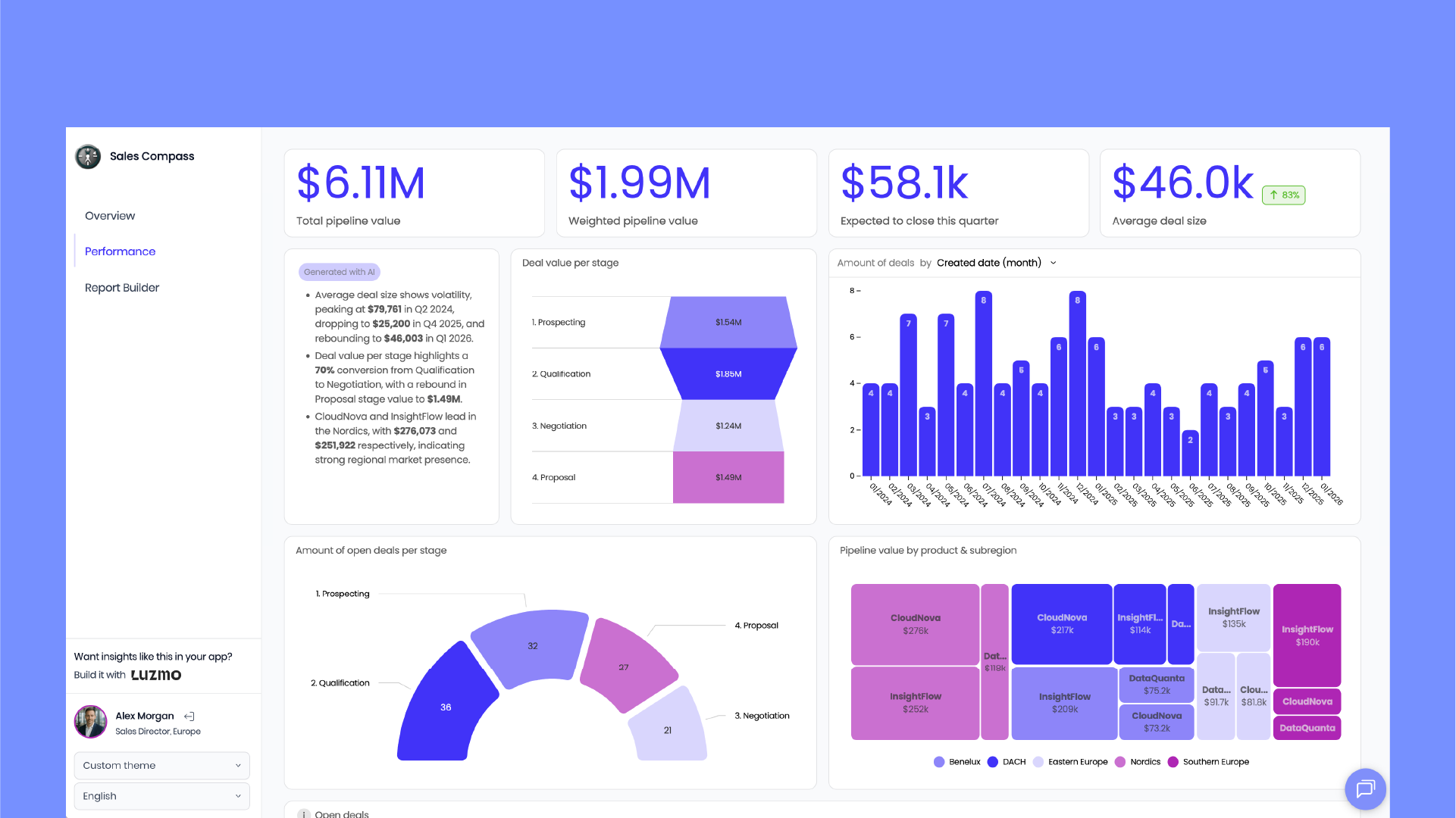 Luzmo Studio is built for product teams who want to launch in-app analytics without heavy engineering, SaaS companies looking to enhance user experience and retention, and organizations that need flexible embedded insights for both app builders and end-users.